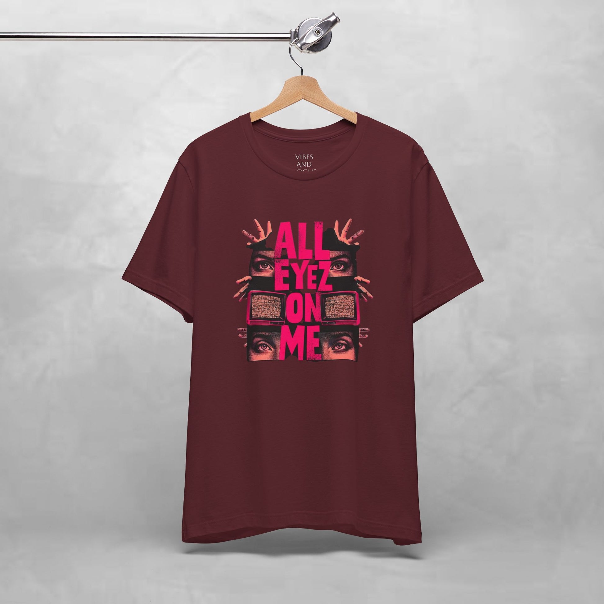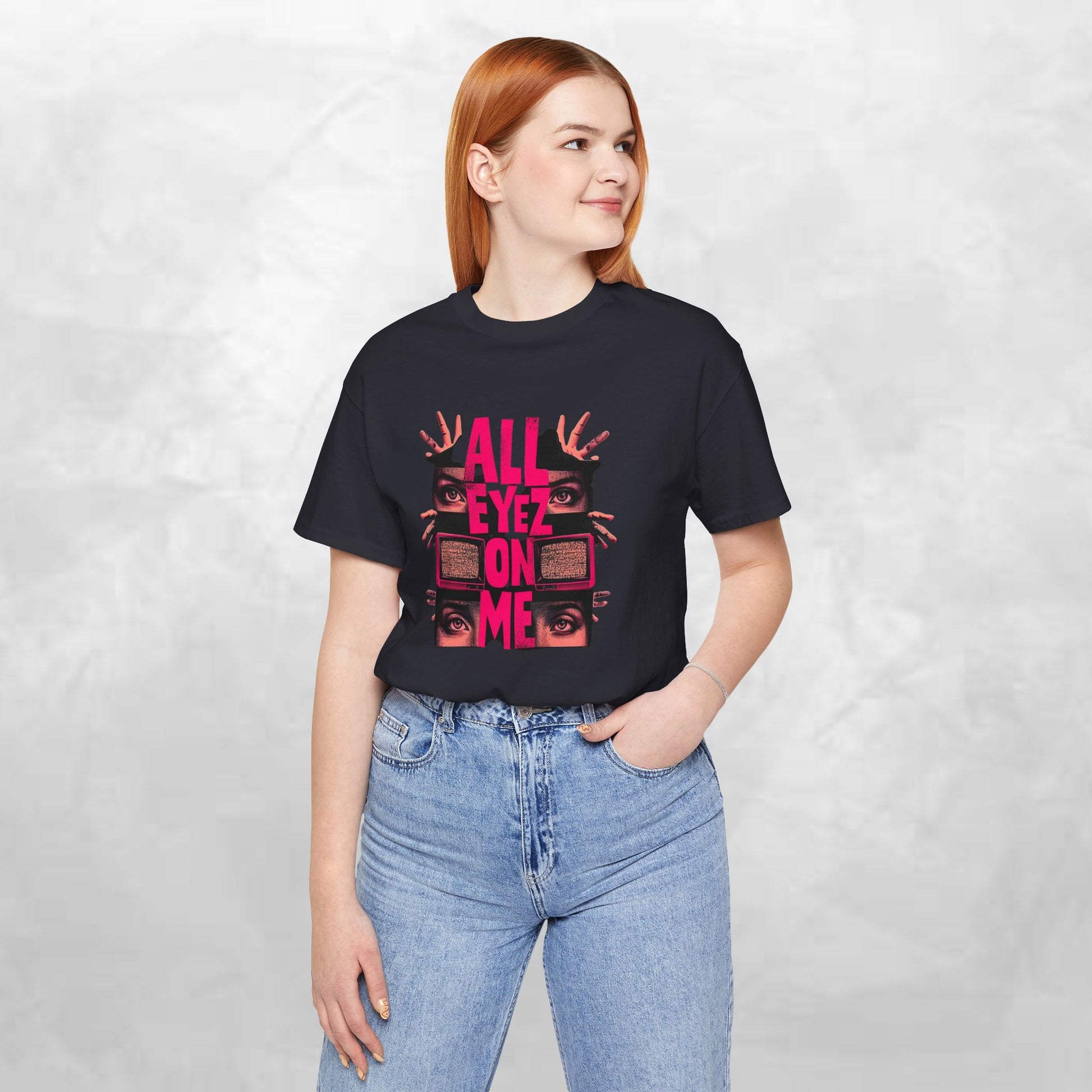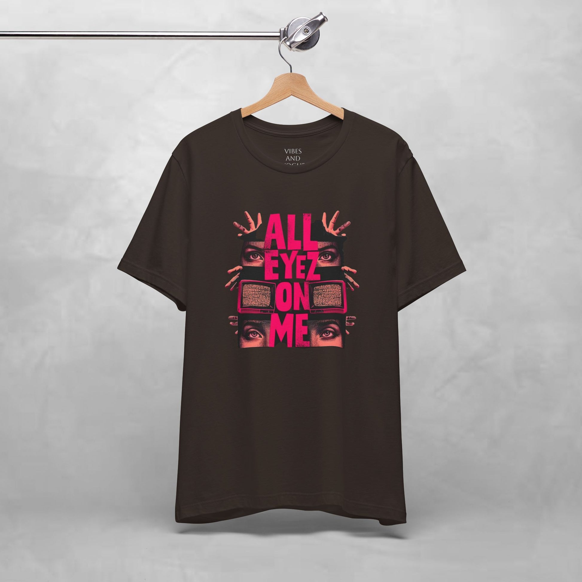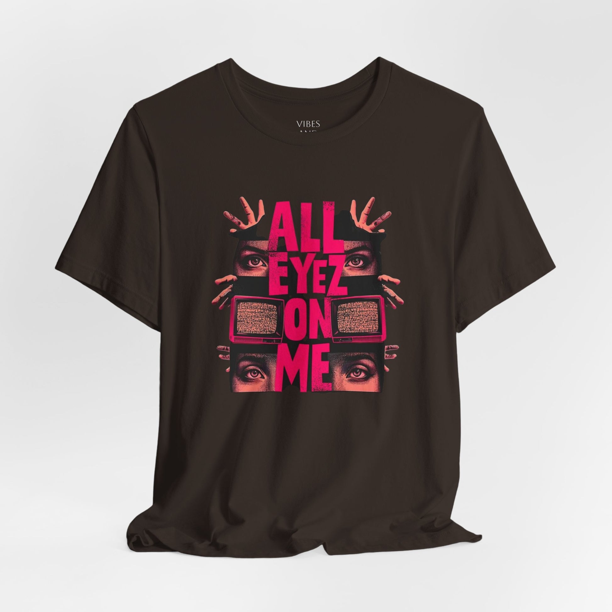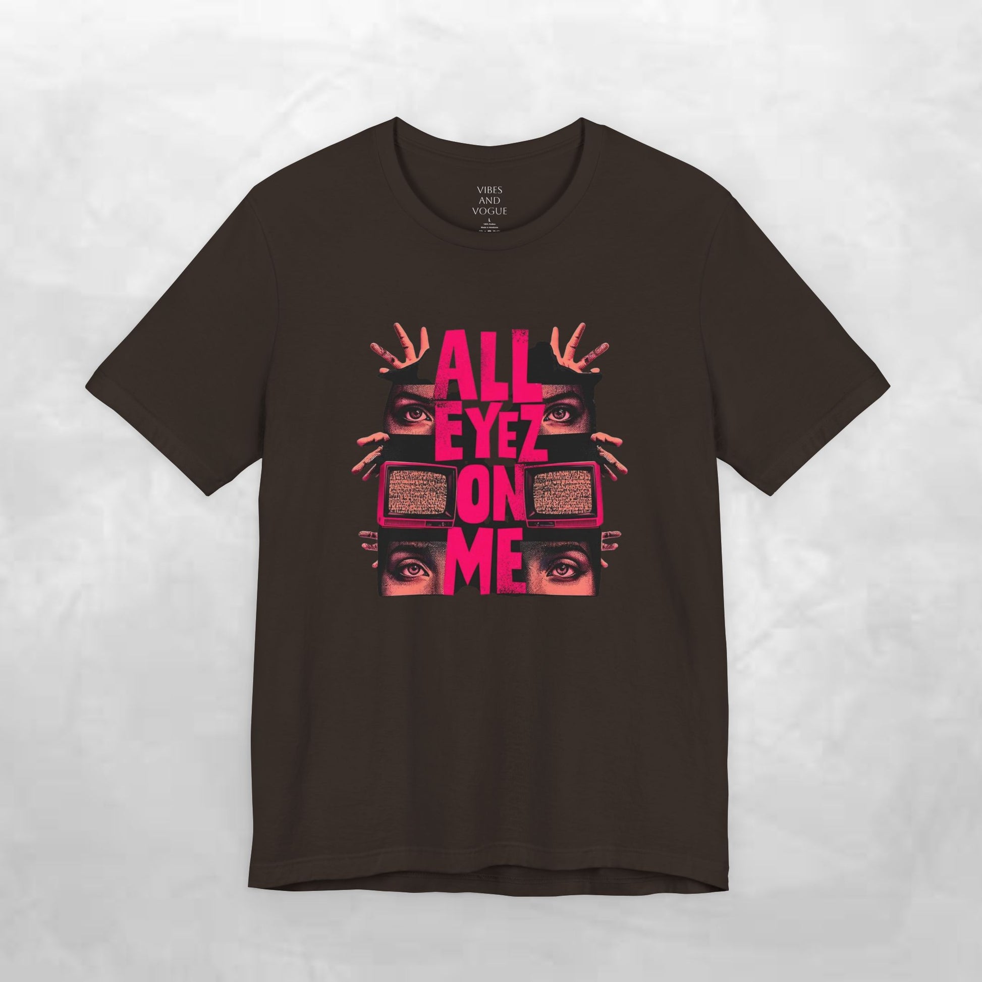 A soft, breathable tee that speaks loud without shouting. The shirt features a bold, retro-inspired graphic: stacked, neon-pink text reading “ALL EYEZ ON ME” framed by watching eyes and vintage television sets. The charcoal/brown base keeps the look grounded while the high-contrast print pulls focus—great for late-night shows, open-mic nights, or wandering city streets. Lightweight Airlume combed cotton feels cool against the skin and layers easily under a jacket. Details like ribbed knit collar, shoulder tape, and side seams keep the fit neat and stable, while a tear-away label keeps irritation away. Made and sourced with attention to ethical manufacturing and REACH compliance.