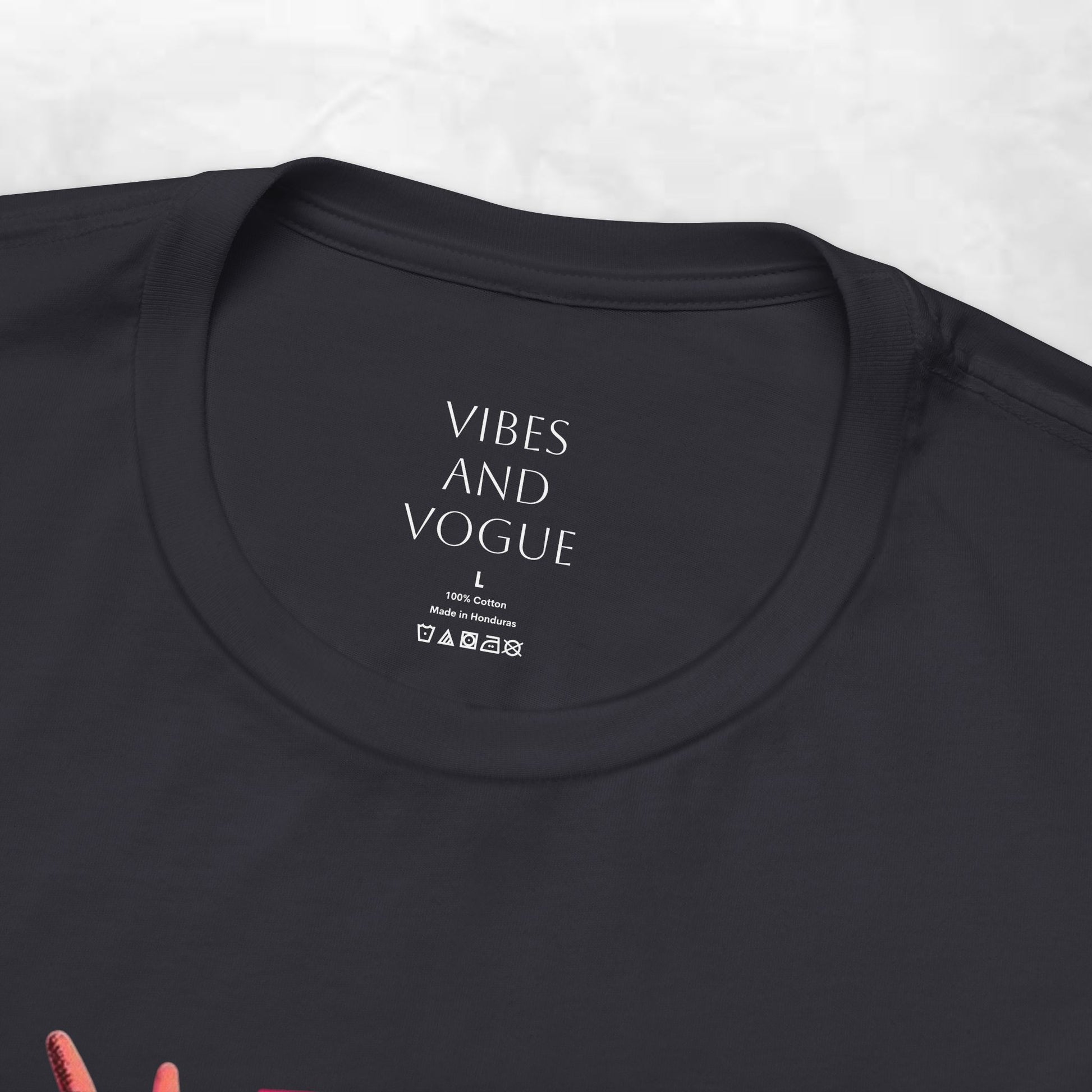 - Bold neon-pink front graphic: stacked text with eye and vintage TV motifs